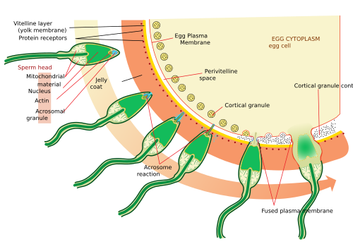 Proces fertilizace zahrnuje proniknutí malé spermie do mnohem většího vajíčka. Nejčastější postupnost začíná ejakulací během kopulace (pohlavního styku), pokračuje ovulací a končí oplodněním. Možné jsou různé výjimky z této postupností včetně umělého oplodnění, fertilizace "in vitro" (ve zkumavce), externí ejakulací bez kopulace nebo kopulace krátce po ovulaci. Před střetem se sekundárním oocytem, akrozom spermie produkuje enzymy, které mu umožní provrtat vnější rosolovitý obal vajíčka. Plazma spermie se pak spojí s plazmou membrány vajíčka, hlava spermie se oddělí od bičíku a vajíčko putuje přes vejcovod do dělohy.